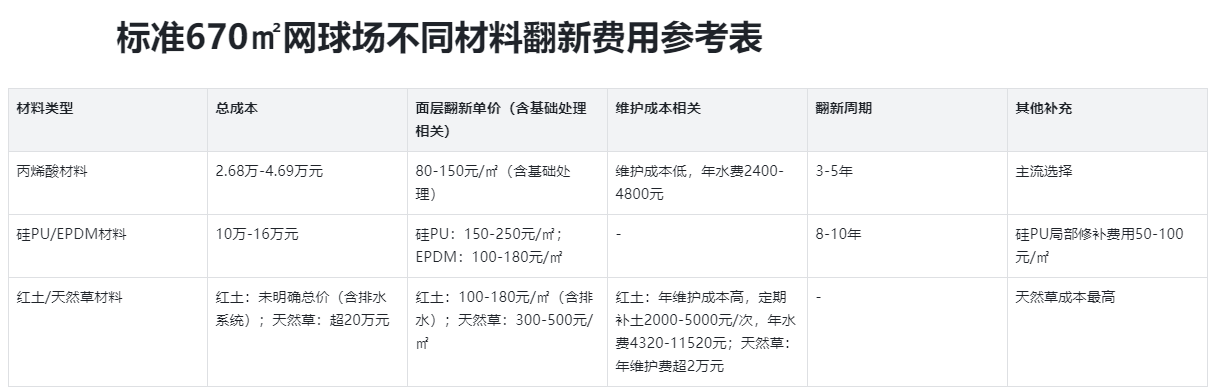 网球场翻新费用受场地面积、基础状况、材料选择、地域差异影响较大,以标准670㎡网球场为例,不同材料翻新总成本参考如下: